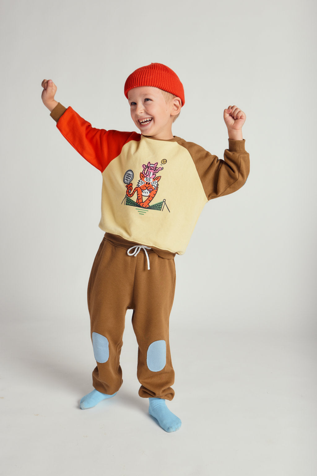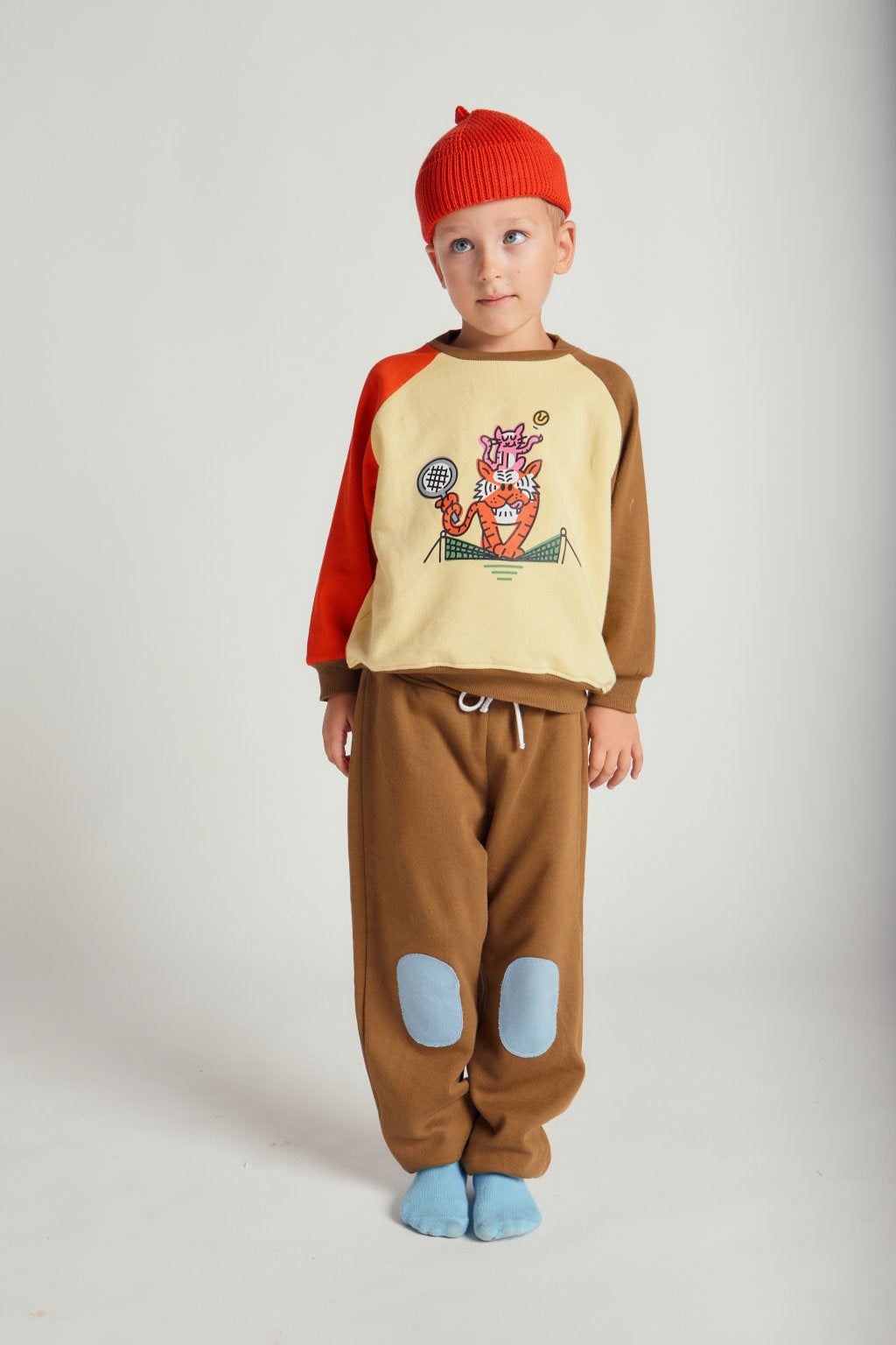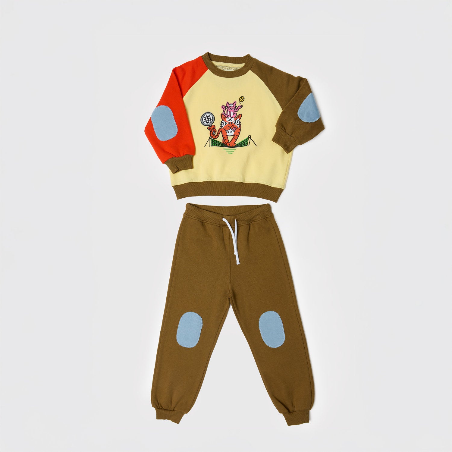 Game, set, match. Dette træningssæt er skabt til små mestre både på og uden for banen. Med raglanærmer og forstærkede lapper på albuer og knæ er det designet til komfort og holdbarhed gennem alle eventyr. Den legende tiger- og katte-tennisgrafik på fronten tilføjer en sporty sjov til looket, mens det bløde bomuldsblandingsstof med en hyggelig inderside holder børnene komfortable hele dagen. Perfekt til skole, weekender og aktiv leg.